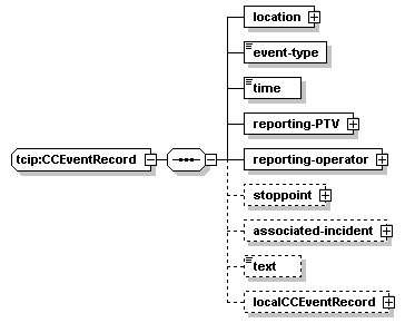 | source | <xs:complexType name="CCEventRecord"> <xs:sequence> <xs:element name="location" type="lrms:GeoLocation"/> <xs:element name="event-type" type="CC-ServiceEventType"/> <xs:element name="time" type="CPT-DateTime"/> <xs:element name="reporting-PTV" type="CPTVehicleIden"/> <xs:element name="reporting-operator" type="CPTOperatorIden"/> <xs:element name="stoppoint" type="CPTStoppointIden" minOccurs="0"/> <xs:element name="associated-incident" type="IMIncidentIden" minOccurs="0"/> <xs:element name="text" type="CPT-Footnote" minOccurs="0"/> <xs:element name="localCCEventRecord" type="local:CCEventRecord" minOccurs="0"/> </xs:sequence> </xs:complexType> |