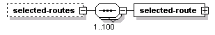 | source | <xs:element name="selected-routes" minOccurs="0"> <xs:complexType> <xs:sequence maxOccurs="100"> <xs:element name="selected-route" type="SCHRouteIden"/> </xs:sequence> </xs:complexType> </xs:element> |