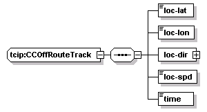 | source | <xs:complexType name="CCOffRouteTrack"> <xs:sequence> <xs:element name="loc-lat" type="lrms:Latitude"/> <xs:element name="loc-lon" type="lrms:Longitude"/> <xs:element name="loc-dir" type="lrms:Angle"/> <xs:element name="loc-spd" type="OB-J1587-VelocityVectorSpeed"/> <xs:element name="time" type="CPT-DateTime"/> </xs:sequence> </xs:complexType> |