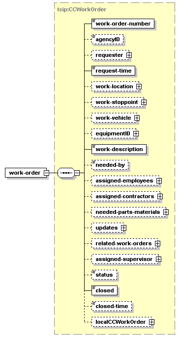 | children | work-order-number agencyID requester request-time work-location work-stoppoint work-vehicle equipmentID work-description needed-by assigned-employees assigned-contractors needed-parts-materials updates related-work-orders assigned-supervisor status closed closed-time localCCWorkOrder | ||||