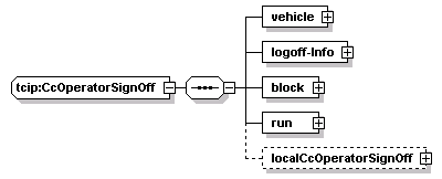 | source | <xs:complexType name="CcOperatorSignOff"> <xs:sequence> <xs:element name="vehicle" type="CPTVehicleIden"/> <xs:element name="logoff-Info" type="CCLogOffOperator"/> <xs:element name="block" type="SCHBlockIden"/> <!-- current or most recent block, --> <xs:element name="run" type="SCHRunIden"/> <!-- current or most recent run --> <xs:element name="localCcOperatorSignOff" type="local:CcOperatorSignOff" minOccurs="0"/> </xs:sequence> </xs:complexType> |