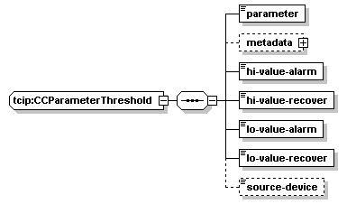 | source | <xs:complexType name="CCParameterThreshold"> <xs:sequence> <xs:element name="parameter" type="OB-PID"/> <xs:element name="metadata" type="CPTRowMetaData" minOccurs="0"/> <xs:element name="hi-value-alarm" type="OB-Parameter"/> <xs:element name="hi-value-recover" type="OB-Parameter"/> <xs:element name="lo-value-alarm" type="OB-Parameter"/> <xs:element name="lo-value-recover" type="OB-Parameter"/> <xs:element name="source-device" type="OB-MID" minOccurs="0"/> </xs:sequence> </xs:complexType> |