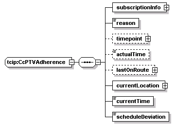 | source | <xs:complexType name="CcPTVAdherence"> <xs:sequence> <xs:element name="subscriptionInfo" type="CPTSubscriptionHeader"/> <xs:element name="reason" type="CC-AdherenceMsgType"/> <xs:element name="timepoint" type="SCHTimepointIden" minOccurs="0"/> <xs:element name="actualTime" type="SCH-Time" minOccurs="0"/> <xs:element name="lastOnRoute" type="lrms:GeoLocation" minOccurs="0"/> <xs:element name="currentLocation" type="lrms:GeoLocation"/> <xs:element name="currentTime" type="CPT-DateTime"/> <xs:element name="scheduleDeviation" type="CPT-Duration"/> </xs:sequence> </xs:complexType> |