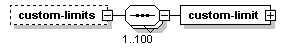 | source | <xs:element name="custom-limits" minOccurs="0"> <xs:complexType> <xs:sequence maxOccurs="100"> <xs:element name="custom-limit" type="CCParameterThreshold"/> </xs:sequence> </xs:complexType> </xs:element> |