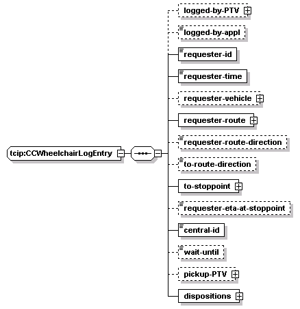 | source | <xs:complexType name="CCWheelchairLogEntry"> <xs:sequence> <xs:element name="logged-by-PTV" type="CPTVehicleIden" minOccurs="0"/> <xs:element name="logged-by-appl" type="CPT-ApplicationID" minOccurs="0"/> <xs:element name="requester-id" type="CC-TravelerRequestID"/> <!-- assigned by requester entity --> <xs:element name="requester-time" type="CPT-DateTime"/> <!-- timerequested --> <xs:element name="requester-vehicle" type="CPTVehicleIden" minOccurs="0"/> <xs:element name="requester-route" type="SCHRouteIden"/> <xs:element name="requester-route-direction" type="lrms:Direction" minOccurs="0"/> <xs:element name="to-route-direction" type="lrms:Direction" minOccurs="0"/> <xs:element name="to-stoppoint" type="CPTStoppointIden"/> <xs:element name="requester-eta-at-stoppoint" type="CPT-DateTime" minOccurs="0"/> <xs:element name="central-id" type="CC-TravelerRequestID"/> <xs:element name="wait-until" type="CPT-DateTime" minOccurs="0"/> <xs:element name="pickup-PTV" type="CPTVehicleIden" minOccurs="0"/> <xs:element name="dispositions"> <xs:complexType> <xs:sequence maxOccurs="3"> <xs:element name="disposition" type="CC-RequestDisposition"/> </xs:sequence> </xs:complexType> </xs:element> </xs:sequence> </xs:complexType> |