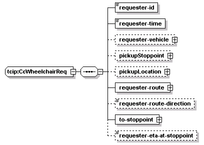 | source | <xs:complexType name="CcWheelchairReq"> <xs:sequence> <xs:element name="requester-id" type="CC-TravelerRequestID"/> <!-- assigned by requester entity --> <xs:element name="requester-time" type="CPT-DateTime"/> <!-- time requested --> <xs:element name="requester-vehicle" type="CPTVehicleIden" minOccurs="0"/> <!-- if already on a vehicle --> <xs:element name="pickupStoppoint" type="CPTStoppointIden" minOccurs="0"/> <!-- if requester is at a stoppoint --> <xs:element name="pickupLocation" type="lrms:GeoLocation" minOccurs="0"/> <!-- if requester not at stoppoint --> <xs:element name="requester-route" type="SCHRouteIden"/> <xs:element name="requester-route-direction" type="lrms:Direction" minOccurs="0"/> <xs:element name="to-stoppoint" type="CPTStoppointIden"/> <xs:element name="requester-eta-at-stoppoint" type="CPT-DateTime" minOccurs="0"/> </xs:sequence> </xs:complexType> |