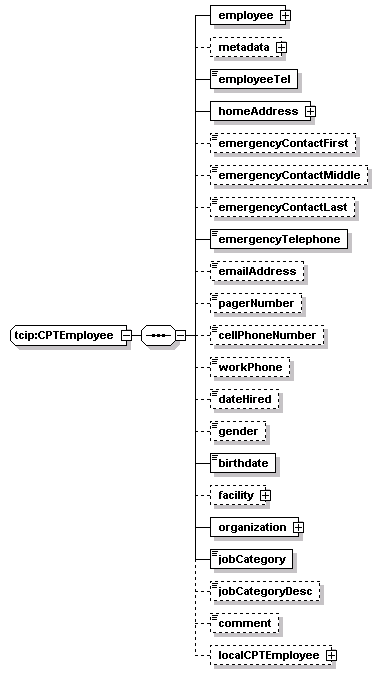 | source | <xs:complexType name="CPTEmployee"> <xs:sequence> <xs:element name="employee" type="CPTEmployeeIden"/> <xs:element name="metadata" type="CPTRowMetaData" minOccurs="0"/> <xs:element name="employeeTel" type="CPT-EmployeeTelephone"/> <xs:element name="homeAddress" type="lrms:AddressPoint"/> <xs:element name="emergencyContactFirst" type="CPT-PersonFirstName" minOccurs="0"/> <xs:element name="emergencyContactMiddle" type="CPT-PersonMiddleName" minOccurs="0"/> <xs:element name="emergencyContactLast" type="CPT-PersonLastName" minOccurs="0"/> <xs:element name="emergencyTelephone" type="CPT-PhoneNumber"/> <xs:element name="emailAddress" type="CPT-Footnote" minOccurs="0"/> <xs:element name="pagerNumber" type="CPT-PhoneNumber" minOccurs="0"/> <xs:element name="cellPhoneNumber" type="CPT-PhoneNumber" minOccurs="0"/> <xs:element name="workPhone" type="CPT-PhoneNumber" minOccurs="0"/> <xs:element name="dateHired" type="CPT-Date" minOccurs="0"/> <xs:element name="gender" type="CPT-Sex" minOccurs="0"/> <xs:element name="birthdate" type="CPT-Date"/> <xs:element name="facility" type="CPTTransitFacilityIden" minOccurs="0"/> <xs:element name="organization" type="CPTOrganizationalUnitIden"/> <xs:element name="jobCategory" type="CPT-EmplJobCat"/> <xs:element name="jobCategoryDesc" type="CPT-EmplJobCatDesc" minOccurs="0"/> <xs:element name="comment" type="CPT-Footnote" minOccurs="0"/> <xs:element name="localCPTEmployee" type="local:CPTEmployee" minOccurs="0"/> </xs:sequence> </xs:complexType> |