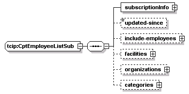 | source | <xs:complexType name="CptEmployeeListSub"> <xs:sequence> <xs:element name="subscriptionInfo" type="CPTSubscriptionHeader"/> <xs:element name="updated-since" type="CPT-DateTime" minOccurs="0"/> <xs:element name="include-employees" minOccurs="0"> <xs:complexType> <xs:sequence maxOccurs="25000"> <xs:element name="include-employee" type="CPTEmployeeIden"/> </xs:sequence> </xs:complexType> </xs:element> <xs:element name="facilities" minOccurs="0"> <xs:complexType> <xs:sequence maxOccurs="100"> <xs:element name="facility" type="CPTTransitFacilityIden"/> </xs:sequence> </xs:complexType> </xs:element> <xs:element name="organizations" minOccurs="0"> <xs:complexType> <xs:sequence maxOccurs="1000"> <xs:element name="organization" type="CPTOrganizationalUnitIden"/> </xs:sequence> </xs:complexType> </xs:element> <xs:element name="categories" minOccurs="0"> <xs:complexType> <xs:sequence maxOccurs="300"> <xs:element name="category" type="CPT-EmplJobCat"/> </xs:sequence> </xs:complexType> </xs:element> </xs:sequence> </xs:complexType> |