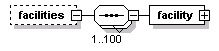 | source | <xs:element name="facilities" minOccurs="0"> <xs:complexType> <xs:sequence maxOccurs="100"> <xs:element name="facility" type="CPTTransitFacilityIden"/> </xs:sequence> </xs:complexType> </xs:element> |