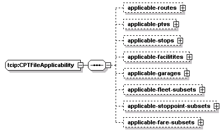 | source | <xs:complexType name="CPTFileApplicability"> <xs:sequence> <xs:element name="applicable-routes" minOccurs="0"> <xs:complexType> <xs:sequence maxOccurs="200"> <xs:element name="applicable-route" type="SCHRouteIden"/> </xs:sequence> </xs:complexType> </xs:element> <xs:element name="applicable-ptvs" minOccurs="0"> <xs:complexType> <xs:sequence maxOccurs="20000"> <xs:element name="applicable-ptv" type="CPTVehicleIden"/> </xs:sequence> </xs:complexType> </xs:element> <xs:element name="applicable-stops" minOccurs="0"> <xs:complexType> <xs:sequence maxOccurs="20000"> <xs:element name="applicable-stop" type="CPTStoppointIden"/> </xs:sequence> </xs:complexType> </xs:element> <xs:element name="applicable-facilitites" minOccurs="0"> <xs:complexType> <xs:sequence maxOccurs="10000"> <xs:element name="applicable-facilitite" type="CPTTransitFacilityIden"/> </xs:sequence> </xs:complexType> </xs:element> <xs:element name="applicable-garages" minOccurs="0"> <xs:complexType> <xs:sequence maxOccurs="100"> <xs:element name="applicable-garage" type="CPTTransitFacilityIden"/> </xs:sequence> </xs:complexType> </xs:element> <xs:element name="applicable-fleet-subsets" minOccurs="0"> <xs:complexType> <xs:sequence maxOccurs="100"> <xs:element name="applicable-fleet-subset" type="CPT-FleetSubset"/> </xs:sequence> </xs:complexType> </xs:element> <xs:element name="applicable-stoppoint-subsets" minOccurs="0"> <xs:complexType> <xs:sequence maxOccurs="100"> <xs:element name="applicable-stoppoint-subset" type="CPT-StoppointSubset"/> </xs:sequence> </xs:complexType> </xs:element> <xs:element name="applicable-fare-subsets" minOccurs="0"> <xs:complexType> <xs:sequence maxOccurs="100"> <xs:element name="applicable-fare-subset" type="FC-FareEquipmentSubset"/> </xs:sequence> </xs:complexType> </xs:element> </xs:sequence> </xs:complexType> |