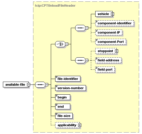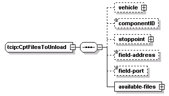 | source | <xs:complexType name="CptFilesToUnload"> <xs:sequence> <xs:element name="vehicle" type="CPTVehicleIden" minOccurs="0"/> <xs:element name="componentID" type="OB-MID" minOccurs="0"/> <xs:element name="stoppoint" type="CPTStoppointIden" minOccurs="0"/> <xs:element name="field-address" type="CPT-IP-Address" minOccurs="0"/> <xs:element name="field-port" type="CPT-UDP-TCP-PortNumber" minOccurs="0"/> <xs:element name="available-files"> <xs:complexType> <xs:sequence maxOccurs="100"> <xs:element name="available-file" type="CPTUnloadFileHeader"/> </xs:sequence> </xs:complexType> </xs:element> </xs:sequence> </xs:complexType> |