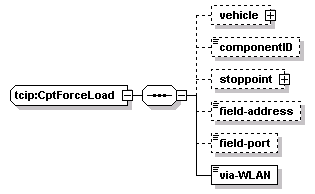 | source | <xs:complexType name="CptForceLoad"> <xs:sequence> <xs:element name="vehicle" type="CPTVehicleIden" minOccurs="0"/> <xs:element name="componentID" type="OB-MID" minOccurs="0"/> <xs:element name="stoppoint" type="CPTStoppointIden" minOccurs="0"/> <xs:element name="field-address" type="CPT-IP-Address" minOccurs="0"/> <xs:element name="field-port" type="CPT-UDP-TCP-PortNumber" minOccurs="0"/> <xs:element name="via-WLAN" type="CPT-Boolean"/> </xs:sequence> </xs:complexType> |