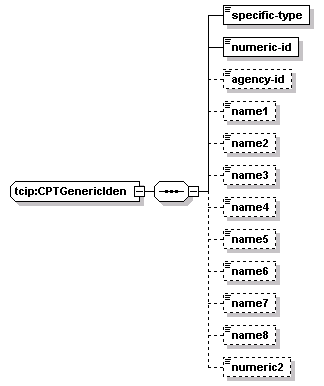| source | <xs:complexType name="CPTGenericIden"> <xs:sequence> <xs:element name="specific-type" type="CPT-FeatureType"/> <xs:element name="numeric-id" type="CPT-GenericCounter"/> <xs:element name="agency-id" type="CPT-AgencyID" minOccurs="0"/> <xs:element name="name1" type="CPT-GenericName" minOccurs="0"/> <xs:element name="name2" type="CPT-GenericName" minOccurs="0"/> <xs:element name="name3" type="CPT-GenericName" minOccurs="0"/> <xs:element name="name4" type="CPT-GenericName" minOccurs="0"/> <xs:element name="name5" type="CPT-GenericName" minOccurs="0"/> <xs:element name="name6" type="CPT-GenericName" minOccurs="0"/> <xs:element name="name7" type="CPT-GenericName" minOccurs="0"/> <xs:element name="name8" type="CPT-GenericName" minOccurs="0"/> <xs:element name="numeric2" type="CPT-GenericCounter" minOccurs="0"/> </xs:sequence> </xs:complexType> |