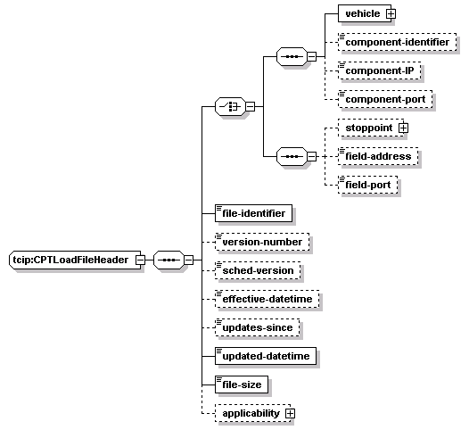 | source | <xs:complexType name="CPTLoadFileHeader"> <xs:sequence> <xs:choice> <xs:sequence> <xs:element name="vehicle" type="CPTVehicleIden"/> <xs:element name="component-identifier" type="OB-MID" minOccurs="0"/> <xs:element name="component-IP" type="CPT-IP-Address" minOccurs="0"/> <xs:element name="component-port" type="CPT-UDP-TCP-PortNumber" minOccurs="0"/> </xs:sequence> <xs:sequence> <xs:element name="stoppoint" type="CPTStoppointIden" minOccurs="0"/> <!-- required if a stoppoint --> <xs:element name="field-address" type="CPT-IP-Address" minOccurs="0"/> <xs:element name="field-port" type="CPT-UDP-TCP-PortNumber" minOccurs="0"/> </xs:sequence> </xs:choice> <xs:element name="file-identifier" type="CPT-FileIdentifier"/> <xs:element name="version-number" type="CPT-FileVersion" minOccurs="0"/> <xs:element name="sched-version" type="SCH-TimetableVersionID" minOccurs="0"/> <xs:element name="effective-datetime" type="CPT-DateTime" minOccurs="0"/> <xs:element name="updates-since" type="CPT-DateTime" minOccurs="0"/> <xs:element name="updated-datetime" type="CPT-DateTime"/> <xs:element name="file-size" type="CPT-FileSize"/> <xs:element name="applicability" type="CPTFileApplicability" minOccurs="0"/> </xs:sequence> </xs:complexType> |