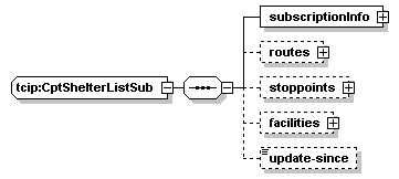 | source | <xs:complexType name="CptShelterListSub"> <xs:sequence> <xs:element name="subscriptionInfo" type="CPTSubscriptionHeader"/> <xs:element name="routes" minOccurs="0"> <xs:complexType> <xs:sequence maxOccurs="500"> <xs:element name="route" type="SCHRouteIden"/> </xs:sequence> </xs:complexType> </xs:element> <xs:element name="stoppoints" minOccurs="0"> <xs:complexType> <xs:sequence maxOccurs="25000"> <xs:element name="stoppoint" type="CPTStoppointIden"/> </xs:sequence> </xs:complexType> </xs:element> <xs:element name="facilities" minOccurs="0"> <xs:complexType> <xs:sequence maxOccurs="500"> <xs:element name="facility" type="CPTTransitFacilityIden"/> </xs:sequence> </xs:complexType> </xs:element> <xs:element name="update-since" type="CPT-DateTime" minOccurs="0"/> </xs:sequence> </xs:complexType> |
