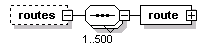 | source | <xs:element name="routes" minOccurs="0"> <xs:complexType> <xs:sequence maxOccurs="500"> <xs:element name="route" type="SCHRouteIden"/> </xs:sequence> </xs:complexType> </xs:element> |