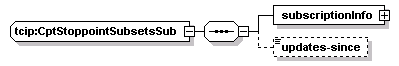| source | <xs:complexType name="CptStoppointSubsetsSub"> <xs:sequence> <xs:element name="subscriptionInfo" type="CPTSubscriptionHeader"/> <xs:element name="updates-since" type="CPT-DateTime" minOccurs="0"/> </xs:sequence> </xs:complexType> |