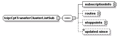 | source | <xs:complexType name="CptTransferClusterListSub"> <xs:sequence> <xs:element name="subscriptionInfo" type="CPTSubscriptionHeader"/> <xs:element name="routes" minOccurs="0"> <xs:complexType> <xs:sequence maxOccurs="500"> <xs:element name="route" type="SCHRouteIden"/> </xs:sequence> </xs:complexType> </xs:element> <xs:element name="stoppoints" minOccurs="0"> <xs:complexType> <xs:sequence maxOccurs="25000"> <xs:element name="stoppoint" type="CPTStoppointIden"/> </xs:sequence> </xs:complexType> </xs:element> <xs:element name="updated-since" type="CPT-DateTime" minOccurs="0"/> </xs:sequence> </xs:complexType> |