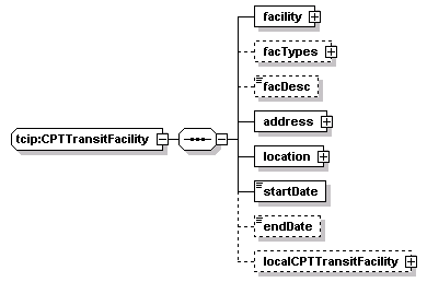 | source | <xs:complexType name="CPTTransitFacility"> <xs:sequence> <xs:element name="facility" type="CPTTransitFacilityIden"/> <xs:element name="facTypes" minOccurs="0"> <xs:complexType> <xs:sequence maxOccurs="25"> <xs:element name="facType" type="CPT-TransitFacilityType"/> </xs:sequence> </xs:complexType> </xs:element> <xs:element name="facDesc" type="CPT-FacilityDesc" minOccurs="0"/> <xs:element name="address" type="lrms:AddressPoint"/> <xs:element name="location" type="lrms:GeoLocation"/> <xs:element name="startDate" type="CPT-Date"/> <xs:element name="endDate" type="CPT-Date" minOccurs="0"/> <xs:element name="localCPTTransitFacility" type="local:CPTTransitFacility" minOccurs="0"/> </xs:sequence> </xs:complexType> |