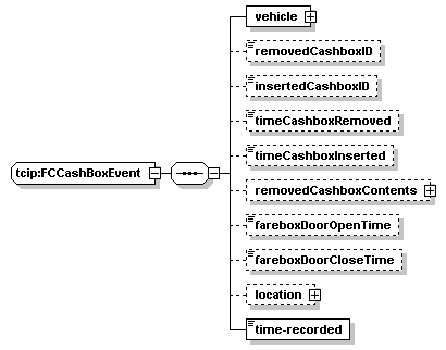 | source | <xs:complexType name="FCCashBoxEvent"> <xs:sequence> <xs:element name="vehicle" type="CPTVehicleIden"/> <xs:element name="removedCashboxID" type="CPT-SerialNumber" minOccurs="0"/> <xs:element name="insertedCashboxID" type="CPT-SerialNumber" minOccurs="0"/> <xs:element name="timeCashboxRemoved" type="CPT-DateTime" minOccurs="0"/> <xs:element name="timeCashboxInserted" type="CPT-DateTime" minOccurs="0"/> <xs:element name="removedCashboxContents" type="FCCashBoxContents" minOccurs="0"/> <xs:element name="fareboxDoorOpenTime" type="CPT-DateTime" minOccurs="0"/> <xs:element name="fareboxDoorCloseTime" type="CPT-DateTime" minOccurs="0"/> <xs:element name="location" type="lrms:GeoLocation" minOccurs="0"/> <xs:element name="time-recorded" type="CPT-DateTime"/> </xs:sequence> </xs:complexType> |
