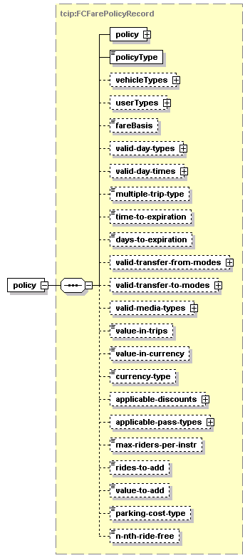 | children | policy policyType vehicleTypes userTypes fareBasis valid-day-types valid-day-times multiple-trip-type time-to-expiration days-to-expiration valid-transfer-from-modes valid-transfer-to-modes valid-media-types value-in-trips value-in-currency currency-type applicable-discounts applicable-pass-types max-riders-per-instr rides-to-add value-to-add parking-cost-type n-nth-ride-free | ||||