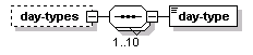 | source | <xs:element name="day-types" minOccurs="0"> <xs:complexType> <xs:sequence maxOccurs="10"> <xs:element name="day-type" type="SCH-DayType"/> </xs:sequence> </xs:complexType> </xs:element> |