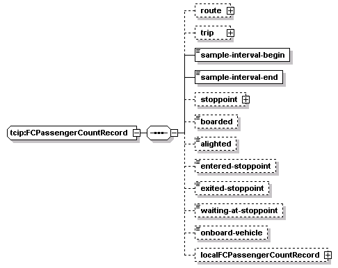 | source | <xs:complexType name="FCPassengerCountRecord"> <xs:sequence> <xs:element name="route" type="SCHRouteIden" minOccurs="0"/> <xs:element name="trip" type="SCHTripIden" minOccurs="0"/> <xs:element name="sample-interval-begin" type="CPT-DateTime"/> <xs:element name="sample-interval-end" type="CPT-DateTime"/> <xs:element name="stoppoint" type="CPTStoppointIden" minOccurs="0"/> <xs:element name="boarded" type="CPT-GenericCounter" minOccurs="0"/> <xs:element name="alighted" type="CPT-GenericCounter" minOccurs="0"/> <xs:element name="entered-stoppoint" type="CPT-GenericCounter" minOccurs="0"/> <xs:element name="exited-stoppoint" type="CPT-GenericCounter" minOccurs="0"/> <xs:element name="waiting-at-stoppoint" type="CPT-GenericCounter" minOccurs="0"/> <xs:element name="onboard-vehicle" type="CPT-GenericCounter" minOccurs="0"/> <xs:element name="localFCPassengerCountRecord" type="local:FCPassengerCountRecord" minOccurs="0"/> </xs:sequence> </xs:complexType> |