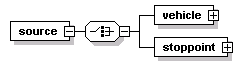 | source | <xs:element name="source"> <xs:complexType> <xs:choice> <xs:element name="vehicle" type="CPTVehicleIden"/> <xs:element name="stoppoint" type="CPTStoppointIden"/> </xs:choice> </xs:complexType> </xs:element> |