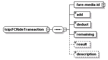 | source | <xs:complexType name="FCRideTransaction"> <xs:sequence> <xs:element name="fare-media-id" type="FCFareMediaID"/> <xs:element name="add" type="FC-RideValueAdd"/> <xs:element name="deduct" type="FC-RideValueDeduct"/> <xs:element name="remaining" type="FC-RideValueRemaining"/> <xs:element name="result" type="FC-TransactionResult" minOccurs="0"/> <xs:element name="description" type="FC-TransactionDescription" minOccurs="0"/> </xs:sequence> </xs:complexType> |