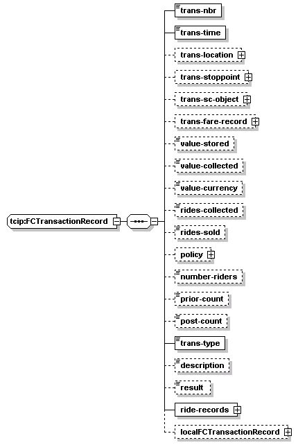 | source | <xs:complexType name="FCTransactionRecord"> <xs:sequence> <xs:element name="trans-nbr" type="FC-FinancialTransactionID"/> <xs:element name="trans-time" type="CPT-DateTime"/> <xs:element name="trans-location" type="lrms:GeoLocation" minOccurs="0"/> <xs:element name="trans-stoppoint" type="CPTStoppointIden" minOccurs="0"/> <xs:element name="trans-sc-object" minOccurs="0"> <xs:complexType> <xs:sequence maxOccurs="20"> <xs:element name="trans-sc-object-item" type="FCSCObjectRecord"/> </xs:sequence> </xs:complexType> </xs:element> <xs:element name="trans-fare-record" type="FCFareRecord" minOccurs="0"/> <xs:element name="value-stored" type="FC-ValueAdd" minOccurs="0"/> <xs:element name="value-collected" type="FC-ValueDeduct" minOccurs="0"/> <xs:element name="value-currency" type="FC-MonetaryInstrAuth" minOccurs="0"/> <xs:element name="rides-collected" type="FC-RideValueDeduct" minOccurs="0"/> <xs:element name="rides-sold" type="FC-RideValueAdd" minOccurs="0"/> <xs:element name="policy" type="FCFarePolicyIden" minOccurs="0"/> <xs:element name="number-riders" type="FC-RidersOnFareInstr" minOccurs="0"/> <xs:element name="prior-count" type="OB-J1587-PassengerCounterPatronCount" minOccurs="0"/> <xs:element name="post-count" type="OB-J1587-PassengerCounterPatronCount" minOccurs="0"/> <xs:element name="trans-type" type="FC-FinancialTransactionType"/> <xs:element name="description" type="FC-TransactionDescription" minOccurs="0"/> <xs:element name="result" type="FC-TransactionDescription" minOccurs="0"/> <xs:element name="ride-records"> <xs:complexType> <xs:sequence maxOccurs="10000"> <xs:element name="ride-record" type="FCRideTransaction"/> </xs:sequence> </xs:complexType> </xs:element> <xs:element name="localFCTransactionRecord" type="local:FCTransactionRecord" minOccurs="0"/> </xs:sequence> </xs:complexType> |