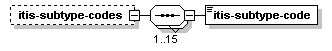 | source | <xs:element name="itis-subtype-codes" minOccurs="0"> <xs:complexType> <xs:sequence maxOccurs="15"> <xs:element name="itis-subtype-code" type="itis:ITIScodes"/> </xs:sequence> </xs:complexType> </xs:element> |