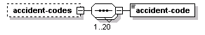 | source | <xs:element name="accident-codes" minOccurs="0"> <xs:complexType> <xs:sequence maxOccurs="20"> <xs:element name="accident-code" type="IM-AccidentCode"/> </xs:sequence> </xs:complexType> </xs:element> |