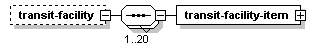 | source | <xs:element name="transit-facility" minOccurs="0"> <xs:complexType> <xs:sequence maxOccurs="20"> <xs:element name="transit-facility-item" type="CPTTransitFacilityIden"/> </xs:sequence> </xs:complexType> </xs:element> |