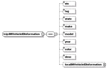 | source | <xs:complexType name="IMVehicleIDInformation"> <xs:sequence> <xs:element name="vin" type="CPT-VIN" minOccurs="0"/> <xs:element name="tag" type="IM-VehicleTag" minOccurs="0"/> <!-- License plate number --> <xs:element name="state" type="IM-VehicleState" minOccurs="0"/> <xs:element name="make" type="IM-VehicleMake" minOccurs="0"/> <xs:element name="model" type="IM-VehicleModel" minOccurs="0"/> <xs:element name="year" type="IM-VehicleYear" minOccurs="0"/> <xs:element name="color" type="IM-VehicleColor" minOccurs="0"/> <xs:element name="desc" type="IM-VehicleDescription" minOccurs="0"/> <xs:element name="localIMVehicleIDInformation" type="local:IMVehicleIDInformation" minOccurs="0"/> </xs:sequence> </xs:complexType> |