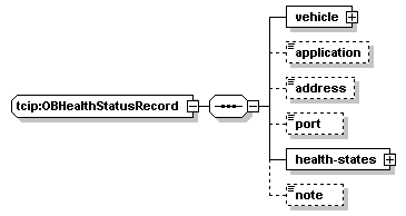 | source | <xs:complexType name="OBHealthStatusRecord"> <xs:sequence> <xs:element name="vehicle" type="CPTVehicleIden"/> <xs:element name="application" type="CPT-ApplicationID" minOccurs="0"/> <xs:element name="address" type="CPT-IP-Address" minOccurs="0"/> <xs:element name="port" type="CPT-UDP-TCP-PortNumber" minOccurs="0"/> <xs:element name="health-states"> <xs:complexType> <xs:sequence maxOccurs="10"> <xs:element name="health-state" type="CPT-HealthStatus"/> </xs:sequence> </xs:complexType> </xs:element> <xs:element name="note" type="CPT-Footnote" minOccurs="0"/> </xs:sequence> </xs:complexType> |