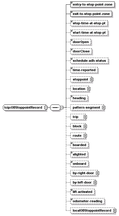 | children | entry-to-stop-point-zone exit-to-stop-point-zone stop-time-at-stop-pt start-time-at-stop-pt doorOpen doorClose schedule-adh-status time-reported stoppoint location heading pattern-segment trip block route boarded alighted onboard by-right-door by-left-door lift-activated odometer-reading localOBStoppointRecord | ||