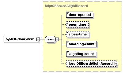 | source | <xs:element name="by-left-door" minOccurs="0"> <xs:complexType> <xs:sequence maxOccurs="75"> <xs:element name="by-left-door-item" type="OBBoardAlightRecord"/> </xs:sequence> </xs:complexType> </xs:element> |