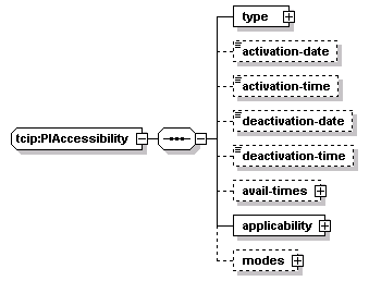 | source | <xs:complexType name="PIAccessibility"> <xs:sequence> <xs:element name="type"> <xs:complexType> <xs:choice> <xs:element name="vehicleAttribute" type="CPT-PTVehicleAttribute"/> <xs:element name="stopAttribute" type="CPT-StoppointAttribute"/> <xs:element name="adaAttribute" type="PI-ADAAccess"/> </xs:choice> </xs:complexType> </xs:element> <xs:element name="activation-date" type="CPT-Date" minOccurs="0"/> <xs:element name="activation-time" type="CPT-DateTime" minOccurs="0"/> <xs:element name="deactivation-date" type="CPT-Date" minOccurs="0"/> <xs:element name="deactivation-time" type="CPT-Time" minOccurs="0"/> <xs:element name="avail-times" minOccurs="0"> <xs:complexType> <xs:sequence maxOccurs="100"> <xs:element name="avail-time" type="PIAvailablePeriod"/> </xs:sequence> </xs:complexType> </xs:element> <xs:element name="applicability"> <xs:complexType> <xs:choice> <xs:element name="applicable-agency" type="CPT-AgencyID"/> <xs:element name="applicable-route" type="SCHRouteIden"/> <xs:element name="applicable-stoppoint" type="CPTStoppointIden"/> </xs:choice> </xs:complexType> </xs:element> <xs:element name="modes" minOccurs="0"> <xs:complexType> <xs:sequence maxOccurs="10"> <xs:element name="mode" type="CPT-Mode"/> </xs:sequence> </xs:complexType> </xs:element> </xs:sequence> </xs:complexType> |