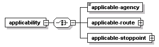 | source | <xs:element name="applicability"> <xs:complexType> <xs:choice> <xs:element name="applicable-agency" type="CPT-AgencyID"/> <xs:element name="applicable-route" type="SCHRouteIden"/> <xs:element name="applicable-stoppoint" type="CPTStoppointIden"/> </xs:choice> </xs:complexType> </xs:element> |