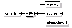 | source | <xs:element name="criteria"> <xs:complexType> <xs:choice> <xs:element name="agency" type="CPT-AgencyID"/> <xs:element name="routes"> <xs:complexType> <xs:sequence maxOccurs="100"> <xs:element name="route" type="SCHRouteIden"/> </xs:sequence> </xs:complexType> </xs:element> <xs:element name="stoppoints"> <xs:complexType> <xs:sequence maxOccurs="100"> <xs:element name="stoppoint" type="CPTStoppointIden"/> </xs:sequence> </xs:complexType> </xs:element> </xs:choice> </xs:complexType> </xs:element> |