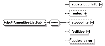 | source | <xs:complexType name="PiAmenitiesListSub"> <xs:sequence> <xs:element name="subscriptionInfo" type="CPTSubscriptionHeader"/> <xs:element name="routes" minOccurs="0"> <xs:complexType> <xs:sequence maxOccurs="500"> <xs:element name="route" type="SCHRouteIden"/> </xs:sequence> </xs:complexType> </xs:element> <xs:element name="stoppoints" minOccurs="0"> <xs:complexType> <xs:sequence maxOccurs="25000"> <xs:element name="stoppoint" type="CPTStoppointIden"/> </xs:sequence> </xs:complexType> </xs:element> <xs:element name="facilities" minOccurs="0"> <xs:complexType> <xs:sequence maxOccurs="500"> <xs:element name="facility" type="CPTTransitFacilityIden"/> </xs:sequence> </xs:complexType> </xs:element> <xs:element name="update-since" type="CPT-DateTime" minOccurs="0"/> </xs:sequence> </xs:complexType> |