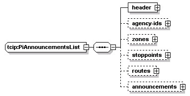 | source | <xs:complexType name="PiAnnouncementsList"> <xs:sequence> <xs:element name="header" type="CPTSubscriptionHeader"/> <xs:element name="agency-ids" minOccurs="0"> <xs:complexType> <xs:sequence maxOccurs="100"> <xs:element name="agency-id" type="CPT-AgencyID"/> </xs:sequence> </xs:complexType> </xs:element> <xs:element name="zones" minOccurs="0"> <xs:complexType> <xs:sequence maxOccurs="100"> <xs:element name="zone" type="PIServiceZoneIden"/> </xs:sequence> </xs:complexType> </xs:element> <xs:element name="stoppoints" minOccurs="0"> <xs:complexType> <xs:sequence maxOccurs="100"> <xs:element name="stoppoint" type="CPTStoppointIden"/> </xs:sequence> </xs:complexType> </xs:element> <xs:element name="routes" minOccurs="0"> <xs:complexType> <xs:sequence maxOccurs="100"> <xs:element name="route" type="SCHRouteIden"/> </xs:sequence> </xs:complexType> </xs:element> <xs:element name="announcements" minOccurs="0"> <xs:complexType> <xs:sequence maxOccurs="10000"> <xs:element name="announcement" type="PIAnnouncement"/> </xs:sequence> </xs:complexType> </xs:element> </xs:sequence> </xs:complexType> |