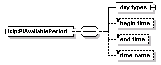 | source | <xs:complexType name="PIAvailablePeriod"> <xs:sequence> <xs:element name="day-types"> <xs:complexType> <xs:sequence maxOccurs="20"> <xs:element name="day-type" type="SCH-DayType"/> </xs:sequence> </xs:complexType> </xs:element> <xs:element name="begin-time" type="CPT-DateTime" minOccurs="0"/> <xs:element name="end-time" type="CPT-Time" minOccurs="0"/> <xs:element name="time-name" type="CPT-TimeName" minOccurs="0"/> </xs:sequence> </xs:complexType> |