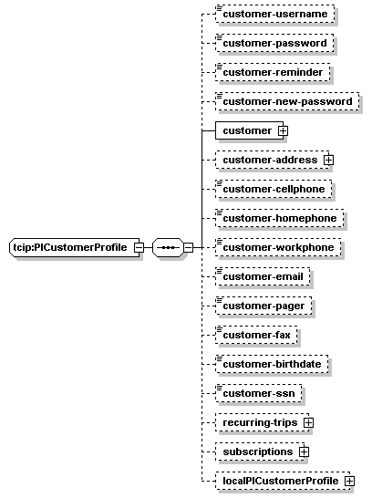 | source | <xs:complexType name="PICustomerProfile"> <xs:sequence> <xs:element name="customer-username" type="CPT-Footnote" minOccurs="0"/> <xs:element name="customer-password" type="CPT-Footnote" minOccurs="0"/> <xs:element name="customer-reminder" type="CPT-Footnote" minOccurs="0"/> <!-- password reminder --> <xs:element name="customer-new-password" type="CPT-Footnote" minOccurs="0"/> <xs:element name="customer" type="PITravelerIden"/> <!-- zero if unassigned --> <xs:element name="customer-address" type="lrms:AddressPoint" minOccurs="0"/> <xs:element name="customer-cellphone" type="IM-HomePhone" minOccurs="0"/> <xs:element name="customer-homephone" type="IM-HomePhone" minOccurs="0"/> <xs:element name="customer-workphone" type="IM-WorkPhone" minOccurs="0"/> <xs:element name="customer-email" type="CPT-Footnote" minOccurs="0"/> <xs:element name="customer-pager" type="IM-HomePhone" minOccurs="0"/> <xs:element name="customer-fax" type="IM-WorkPhone" minOccurs="0"/> <xs:element name="customer-birthdate" type="CPT-Date" minOccurs="0"/> <xs:element name="customer-ssn" type="CPT-SSN" minOccurs="0"/> <xs:element name="recurring-trips" minOccurs="0"> <xs:complexType> <xs:sequence maxOccurs="20"> <xs:element name="recurring-trip" type="PIRecurringTrip"/> </xs:sequence> </xs:complexType> </xs:element> <xs:element name="subscriptions" minOccurs="0"> <xs:complexType> <xs:sequence maxOccurs="20"> <xs:element name="subscription" type="PICustSubscription"/> </xs:sequence> </xs:complexType> </xs:element> <xs:element name="localPICustomerProfile" type="local:PICustomerProfile" minOccurs="0"/> </xs:sequence> </xs:complexType> |