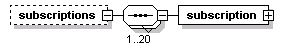 | source | <xs:element name="subscriptions" minOccurs="0"> <xs:complexType> <xs:sequence maxOccurs="20"> <xs:element name="subscription" type="PICustSubscription"/> </xs:sequence> </xs:complexType> </xs:element> |