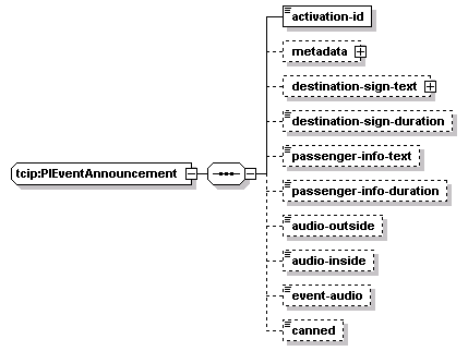 | source | <xs:complexType name="PIEventAnnouncement"> <xs:sequence> <xs:element name="activation-id" type="SCH-ActivationID"/> <xs:element name="metadata" type="CPTRowMetaData" minOccurs="0"/> <xs:element name="destination-sign-text" type="CCDestinationSignMessage" minOccurs="0"/> <xs:element name="destination-sign-duration" type="CPT-Duration" minOccurs="0"/> <xs:element name="passenger-info-text" type="PI-DMSMessage" minOccurs="0"/> <xs:element name="passenger-info-duration" type="CPT-Duration" minOccurs="0"/> <xs:element name="audio-outside" type="CPT-Boolean" minOccurs="0"/> <xs:element name="audio-inside" type="CPT-Boolean" minOccurs="0"/> <xs:element name="event-audio" type="PI-BinaryAudioData" minOccurs="0"/> <xs:element name="canned" type="CC-AnnouncementMsgID" minOccurs="0"/> </xs:sequence> </xs:complexType> |