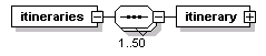 | source | <xs:element name="itineraries"> <xs:complexType> <xs:sequence maxOccurs="50"> <xs:element name="itinerary" type="atis:Route"/> </xs:sequence> </xs:complexType> </xs:element> |