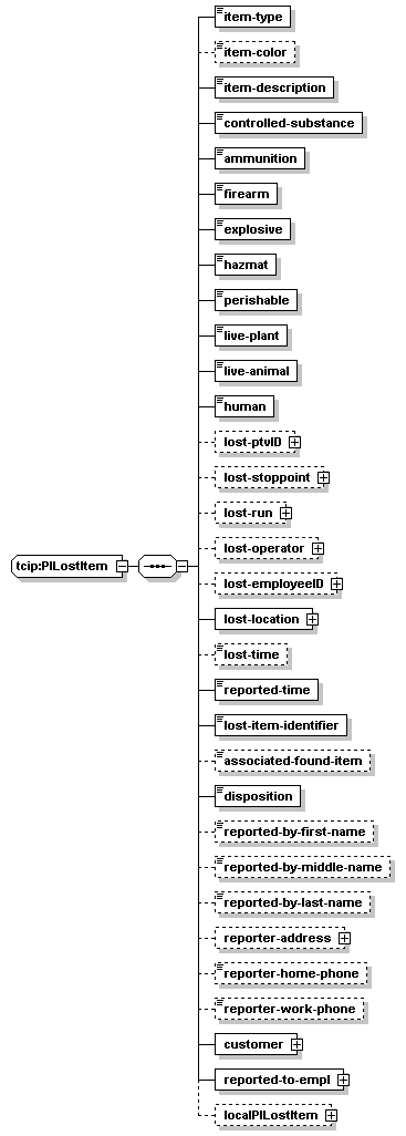 | children | item-type item-color item-description controlled-substance ammunition firearm explosive hazmat perishable live-plant live-animal human lost-ptvID lost-stoppoint lost-run lost-operator lost-employeeID lost-location lost-time reported-time lost-item-identifier associated-found-item disposition reported-by-first-name reported-by-middle-name reported-by-last-name reporter-address reporter-home-phone reporter-work-phone customer reported-to-empl localPILostItem | ||