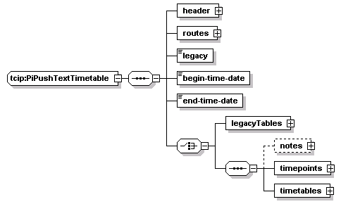 | source | <xs:complexType name="PiPushTextTimetable"> <xs:sequence> <xs:element name="header" type="CPTPushHeader"/> <xs:element name="routes"> <xs:complexType> <xs:sequence maxOccurs="1000"> <xs:element name="route" type="SCHRouteIden"/> </xs:sequence> </xs:complexType> </xs:element> <xs:element name="legacy" type="CPT-Boolean"/> <xs:element name="begin-time-date" type="CPT-DateTime"/> <xs:element name="end-time-date" type="CPT-DateTime"/> <xs:choice> <xs:element name="legacyTables"> <xs:complexType> <xs:sequence maxOccurs="1000"> <xs:element name="legacyTable" type="PIPublishedSchedule"/> </xs:sequence> </xs:complexType> </xs:element> <xs:sequence> <xs:element name="notes" minOccurs="0"> <xs:complexType> <xs:sequence maxOccurs="1000"> <xs:element name="note" type="SCHNoteInfo"/> <!-- notes for all included timetables --> </xs:sequence> </xs:complexType> </xs:element> <xs:element name="timepoints"> <xs:complexType> <xs:sequence maxOccurs="10000"> <xs:element name="timepoint" type="PITimetableTimepoint"/> </xs:sequence> </xs:complexType> </xs:element> <xs:element name="timetables"> <xs:complexType> <xs:sequence maxOccurs="1000"> <xs:element name="timetable" type="PIXMLTimetable"/> </xs:sequence> </xs:complexType> </xs:element> </xs:sequence> </xs:choice> </xs:sequence> </xs:complexType> |