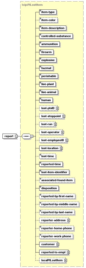 | children | item-type item-color item-description controlled-substance ammunition firearm explosive hazmat perishable live-plant live-animal human lost-ptvID lost-stoppoint lost-run lost-operator lost-employeeID lost-location lost-time reported-time lost-item-identifier associated-found-item disposition reported-by-first-name reported-by-middle-name reported-by-last-name reporter-address reporter-home-phone reporter-work-phone customer reported-to-empl localPILostItem | ||||